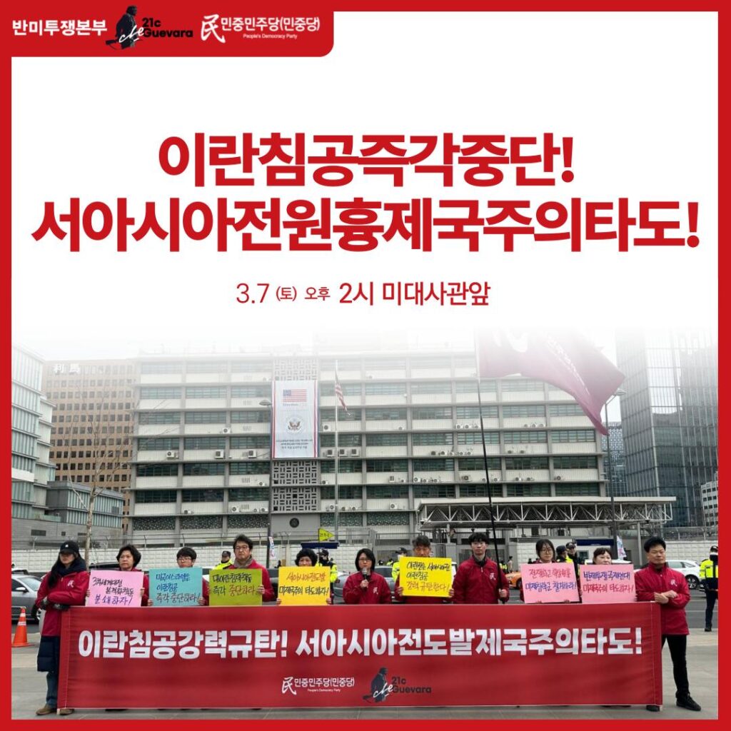 Sign in Welcome! Log into your account your username your password Forgot your password? Get help 개인정보처리방침 Password recovery Recover your password your email A password will be e-mailed to you. Home소식 소식 3.7토 14시 미대사관앞 〈이란침공강력규탄! 서아시아전원흉제국주의타도!〉정당연설회 2026년 3월 3일 Previous article〈트럼프는 3차세계대전의 특급전범〉 민중민주당 미대사관앞 10차정당연설회 Next article3.8일 14시 미대사관앞 〈여성반제투사실리아석방! 여성억압제국주의타도!〉정당연설회 - Advertisement - 최신글 〈마두로석방! 볼리바르혁명지지! 제국주의타도!〉 민중민주당 미대사관앞 정당연설회 2026년 3월 3일 〈석권호를 석방하라! 국가보안법 철폐하라!〉 민중민주당인권위 광화문정부청사앞 석권호석방투쟁 연대 2026년 3월 3일 3.8일 14시 미대사관앞 〈여성반제투사실리아석방! 여성억압제국주의타도!〉정당연설회 2026년 3월 3일 〈트럼프는 3차세계대전의 특급전범〉 민중민주당 미대사관앞 10차정당연설회 2026년 3월 2일 〈이란침공은 제국주의멸망의 시작이 될 것〉 민중민주당 미대사관앞 9차정당연설회 2026년 3월 2일