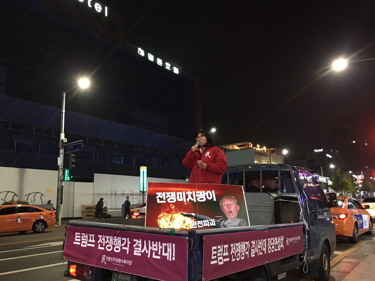트럼프 전쟁행각 결사반대! 트럼프숙소 그랜드하얏트호텔앞 철야정당연설회