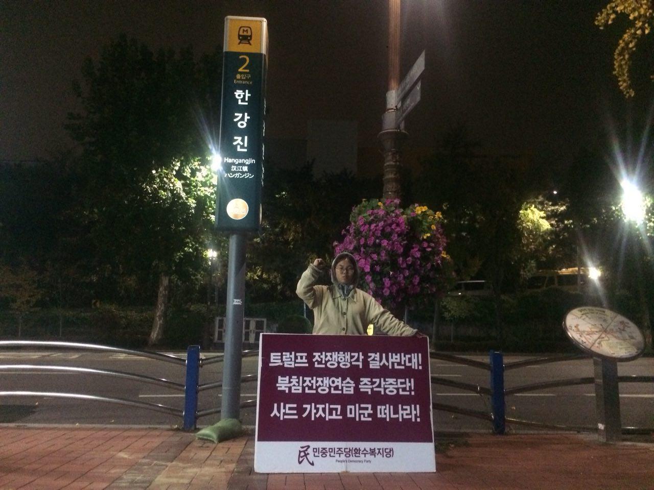한편으로는 7일 저녁 호텔근처 지하철역인 한강진역과 이태원역 앞에서 <트럼프 전쟁행각 결사반대>·<북침전쟁연습중단!> 정당연설회와 1인시위도 전개했습니다.