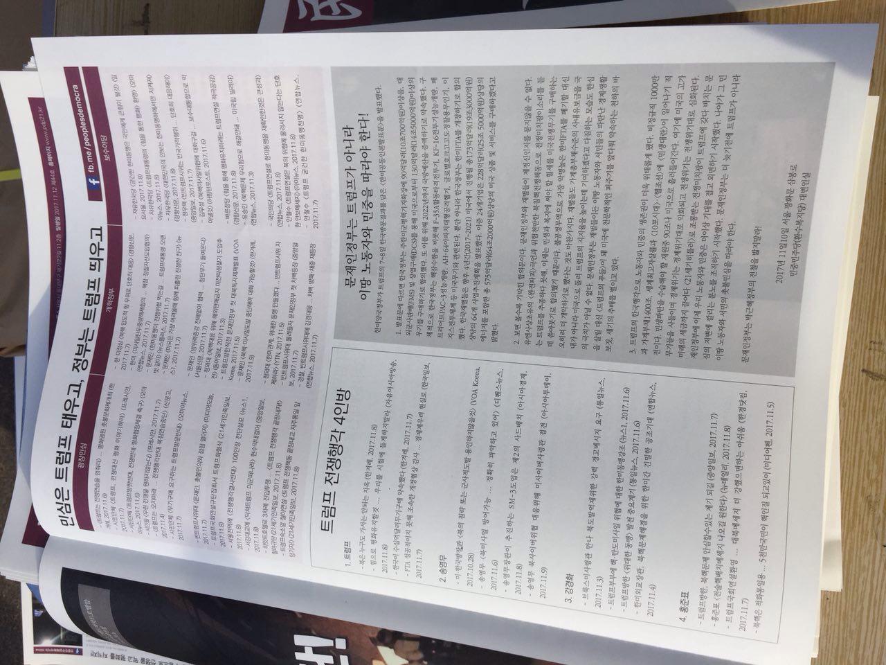 실천 11.12 전국노동자대회 우리당의 선전전(사진) 2017년 11월 12일 FacebookX 서울 광화문에서 진행되고 있는 전국노동자대회 현장 곳곳에서 당원들은 신문, 손피시, 스티커를 노동자들에게 배포하고, 포스터를 부착하고 있습니다. 1.전태일열사정신계승 노동악법철폐 2.노동자의 노조할 권리 보장 3.모든 비정규직을 정규직으로 4.북침전쟁연습 즉각 중단 5.트럼프를 끝장내자 6.사드 가지고 미군 떠나라