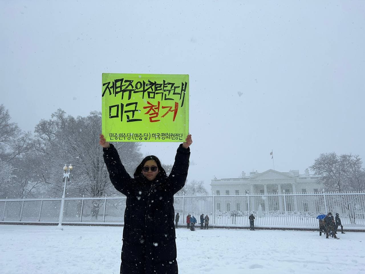 민중민주당(민중당) 미국평화원정단은 3일(현지시간) 워싱턴D.C 백악관앞에서 <제국주의침략군대 미군철거!>, <북침전쟁연습 영구중단!>, <대북적대정책 완전폐기!>, <굴욕적인 미일남동맹 해체!>, <쿠바 내정간섭 즉각 중단!>을 촉구하는 평화시위를 총1690일째 진행했다.