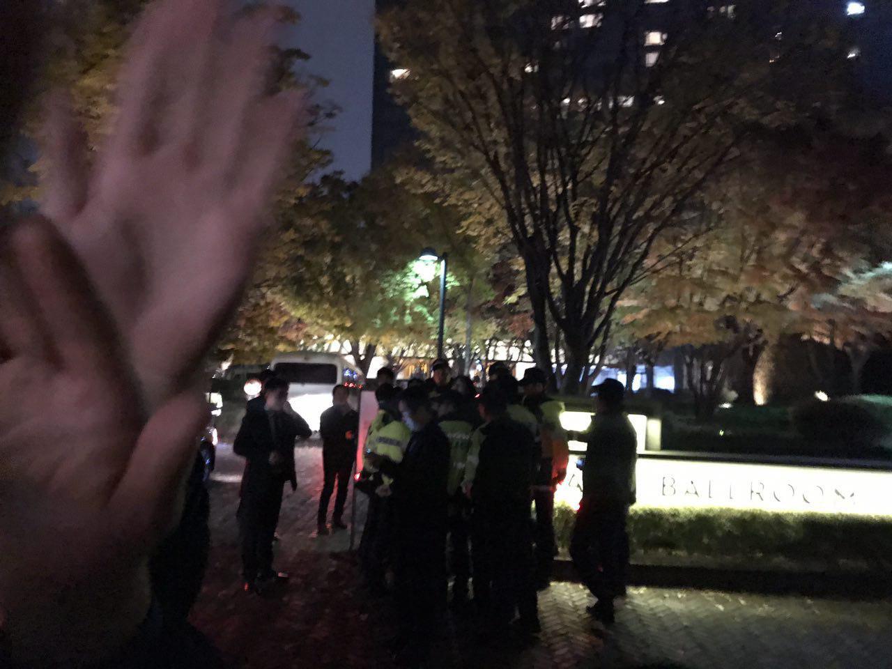 민중민주당(환수복지당)당원이 7일 저녁10시경 트럼프숙소인 하얏트호텔앞에서 <트럼프 전쟁행각 결사반대!> 규탄시위를 전개했다.
