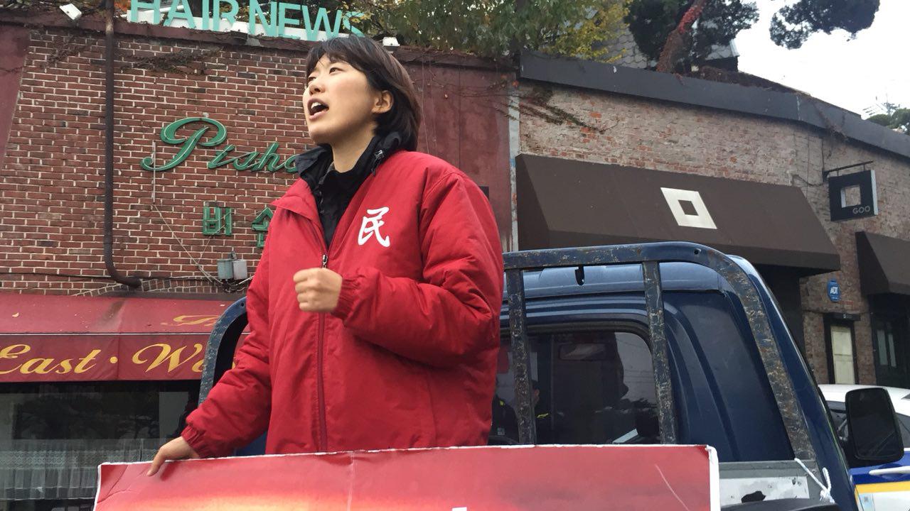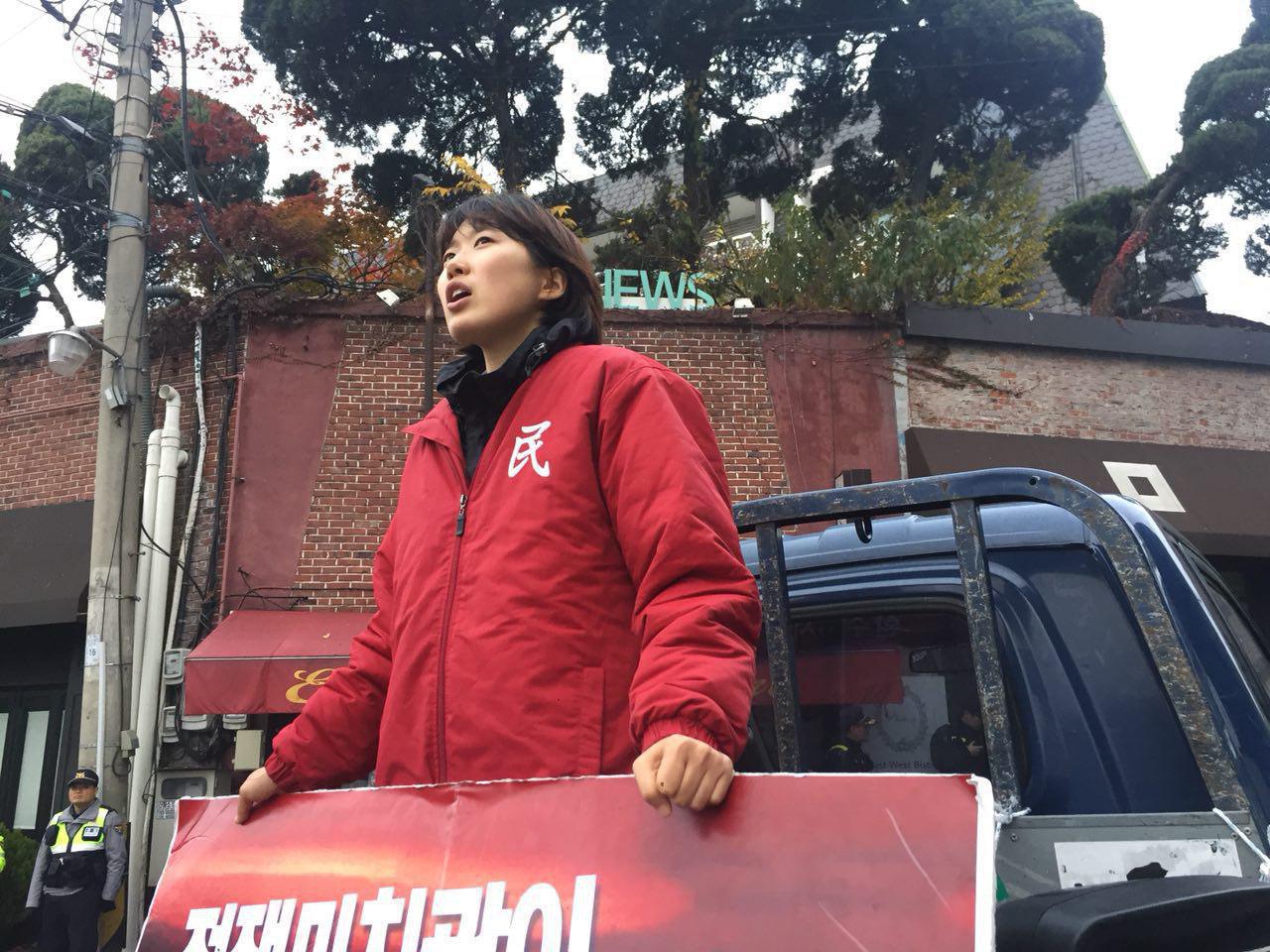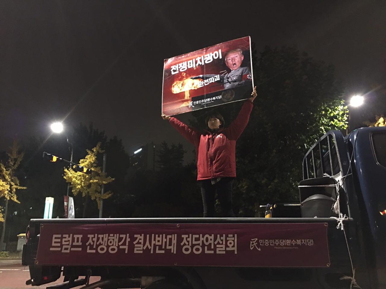 청년레지스탕스단장이자 전북도당학생위원장인 채은샘당원은 <트럼프를 곱게 보내줄 생각이 전혀 없다. 나는 오늘 피끓는 심정으로 이곳에 섰다. 우리 민중을 대표해서 나는 트럼프에게 똑똑히 경고하러 왔다.>며 결연한 의지를 밝혔습니다.