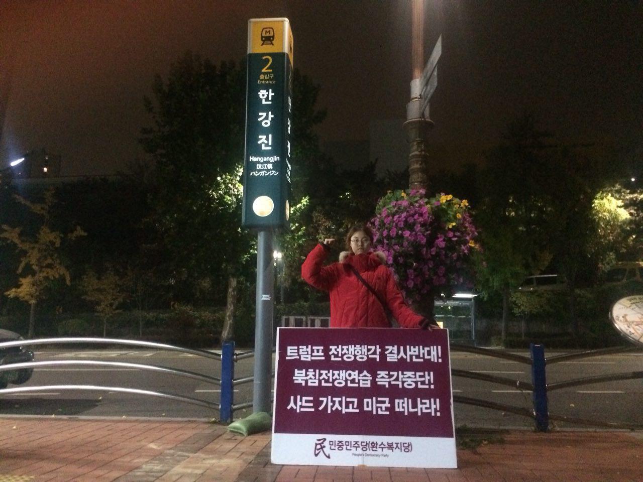 한편으로는 7일 저녁 호텔근처 지하철역인 한강진역과 이태원역 앞에서 <트럼프 전쟁행각 결사반대>·<북침전쟁연습중단!> 정당연설회와 1인시위도 전개했습니다.