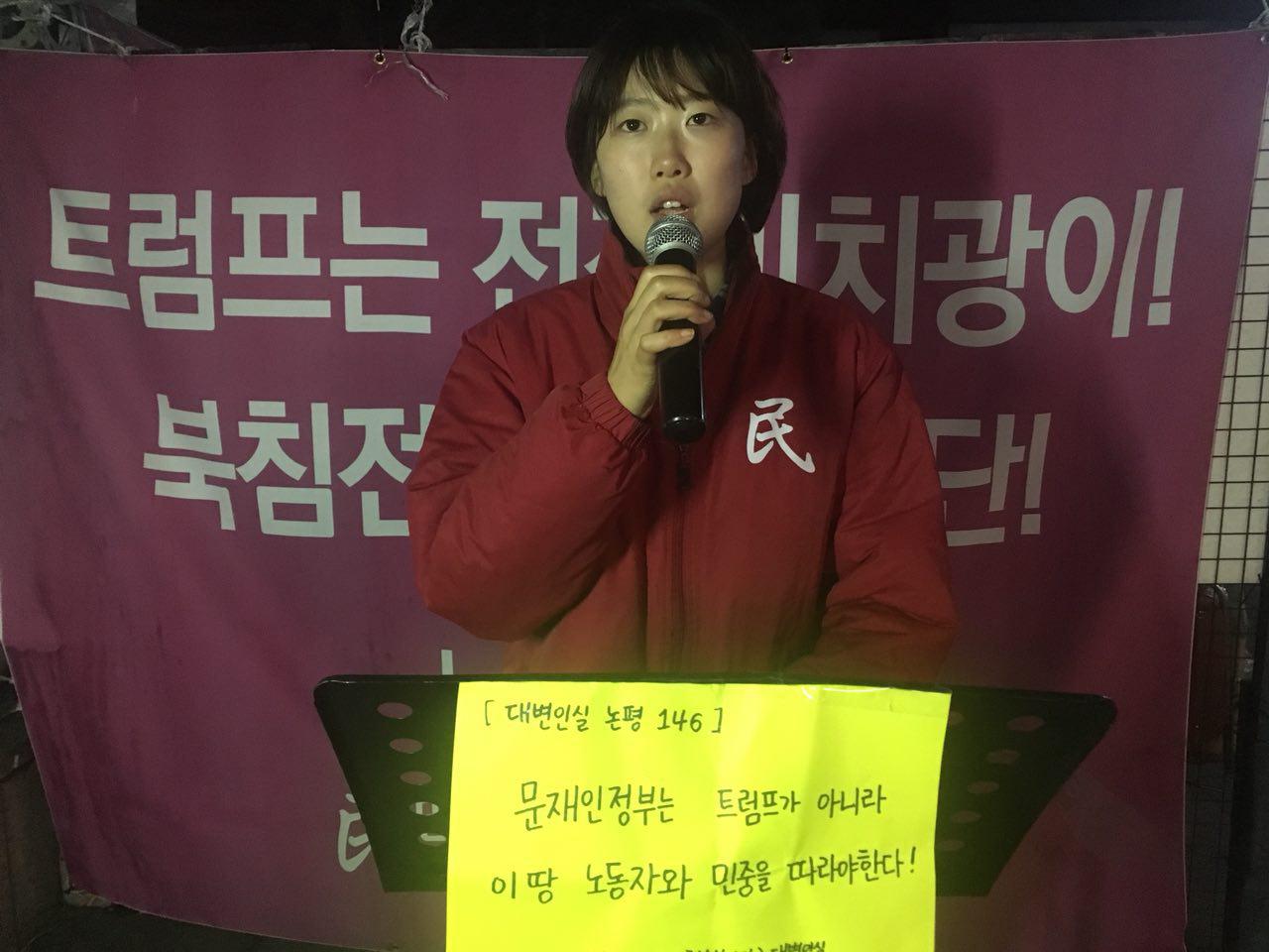 3. 트럼프의 한국행각으로 노동자와 민중의 생존권이 더욱 위태롭게 됐다. 비정규직 1000만과 가계부채1400조, 세계최고자살률과 <10포시대>·<헬조선>에 <민생대란>이 일어나기 직전이다. 민생파탄을 수습해야 할 재원중 90조나 미국으로 흘러들어간다. 여기에 미국의 고가무기들을 사들이며 경제위기는 경제위기대로 악화되고 전쟁위기는 전쟁위기대로 심화된다. 미래의 세금까지 끌어다 <21세기히틀러>로 조롱받는 전쟁미치광이 트럼프에 갖다 바치는 문재인정부에 이제 우리 노동자와 민중은 더이상 기대를 접고 외면하기 시작했다. 나아가 그 민심의 저변에 깔리는 분노를 조직하기 시작했다. 문재인정부는 더 늦기전에 트럼프가 아니라 이땅 노동자와 서민의 촛불민심을 따라야 한다.