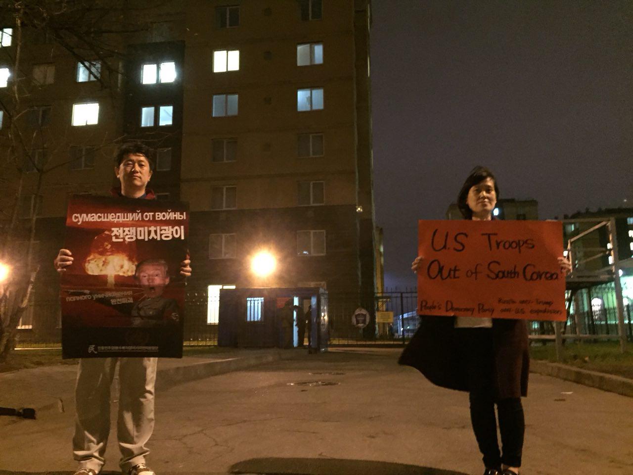 원정단은 <브로큰 링>을 배경으로 반트럼프반미시위를 벌이고, 이후 상트페테르부르크의 사관학교(Общежитие ВМедА Им. Кирова)앞으로 이동해 시위를 이어갔습니다.