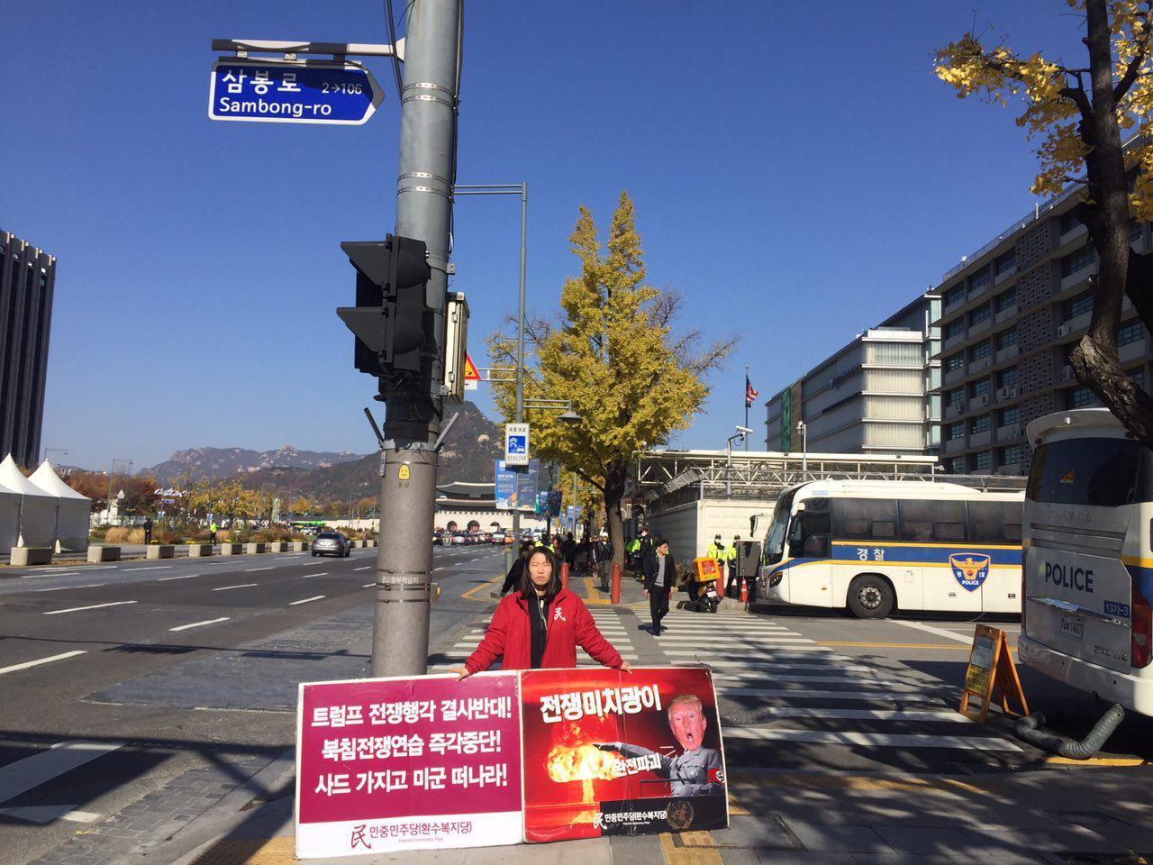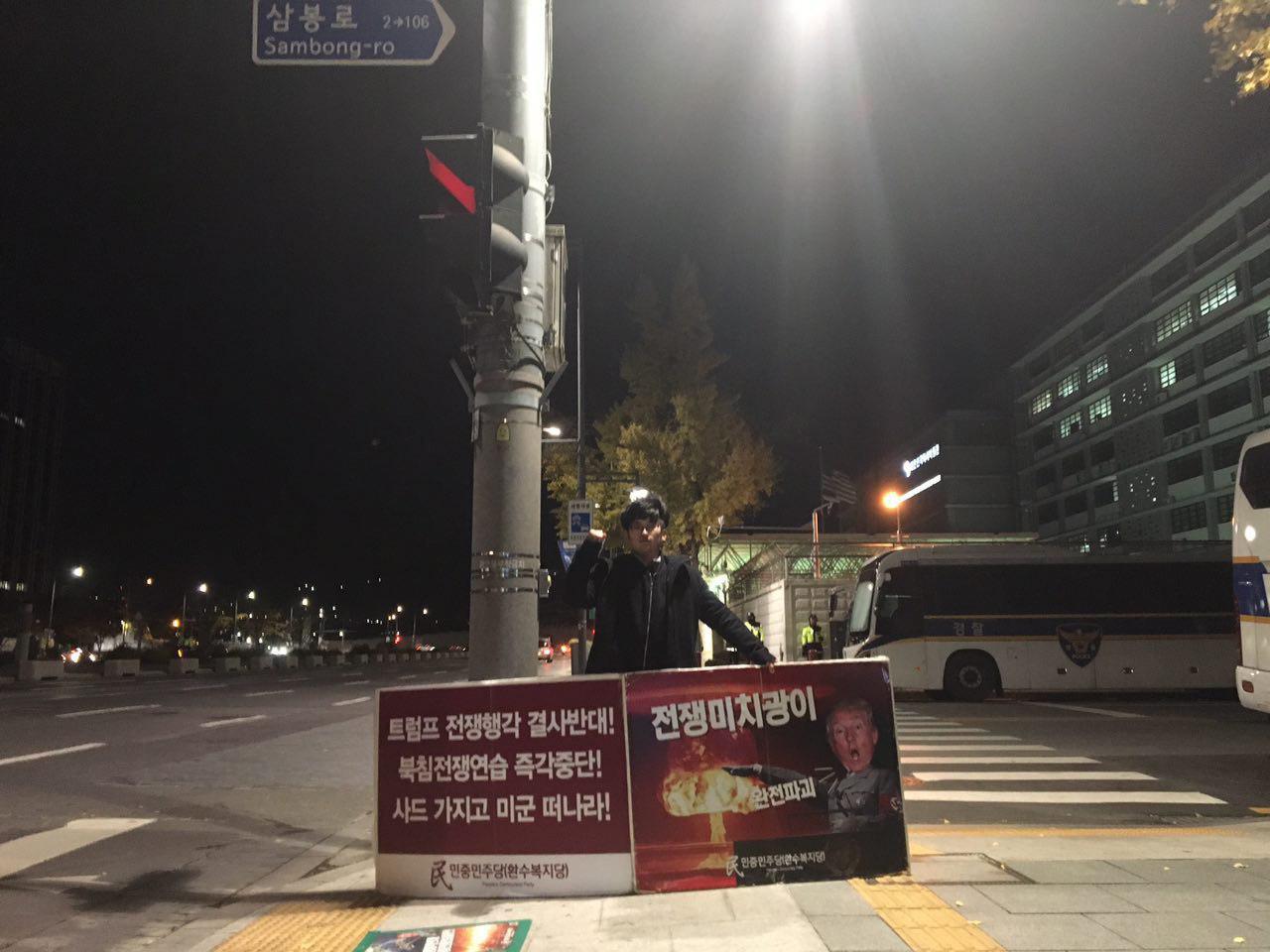 트럼프의 전쟁행각이후 11일부터 13일까지 한반도 인근 해상에서 3개 핵항모강습단이 참가하는 한미합동북침전쟁연습이 벌어지는 것을 규탄하며 당원들은 오늘부터 <북침전쟁연습 중단!>·<전쟁광 트럼프 끝장내자!>·<사드 가지고 미군 떠나라!> 새 구호판과 트럼프 <전쟁미치광이!> 구호판을 들고 24시간 1인시위를 진행했습니다.