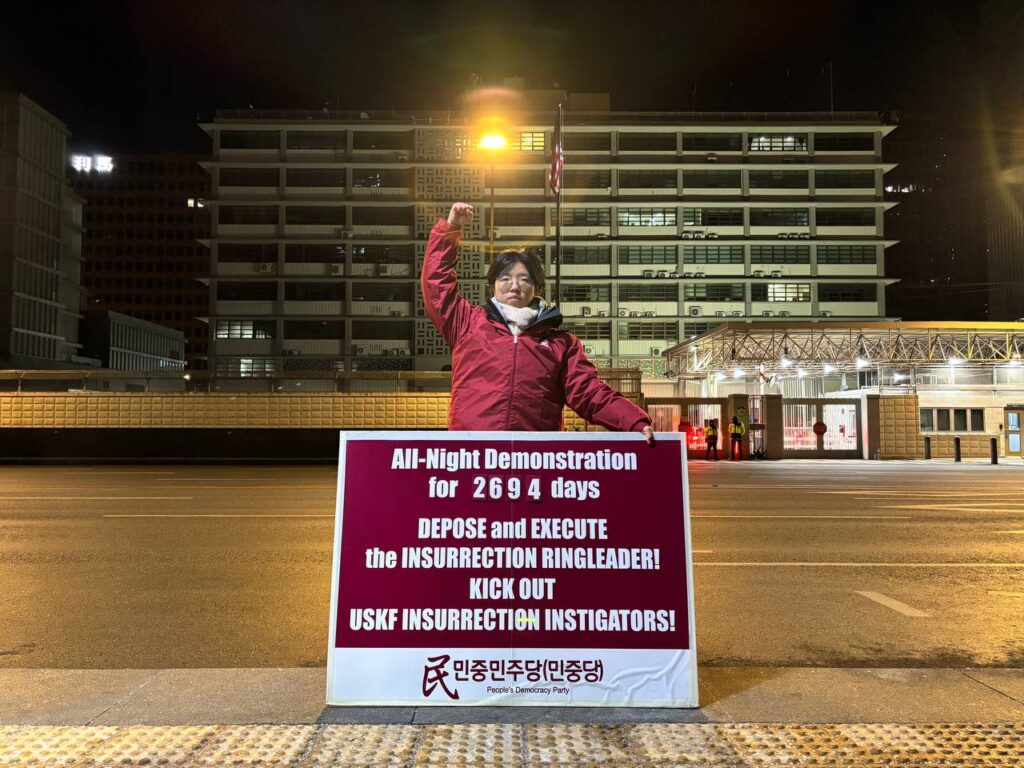10일 민중민주당(민중당)은 미대사관앞에서 <내란수괴 파면!사형! 내란배후 미군철거!> 구호를 들고 평화시위를 3127일째 전개했다.