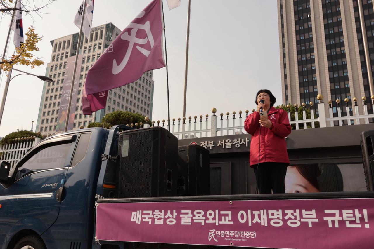 27~29일 <날강도 전쟁책동 트럼프 방한 반대!> 정당연설회 11차례에 이어 민중민주당(민중당)은 30일 정부청사앞에서 <매국협상 굴욕외교 이재명정부 규탄!> 정당연설회를 5회연속 전개하고 트럭선동을 동원해 광화문일대를 행진했다.