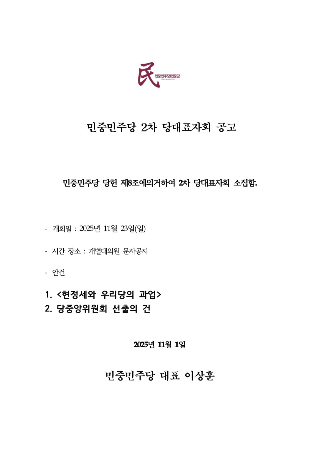 [공고] 민중민주당 2차당대표자회