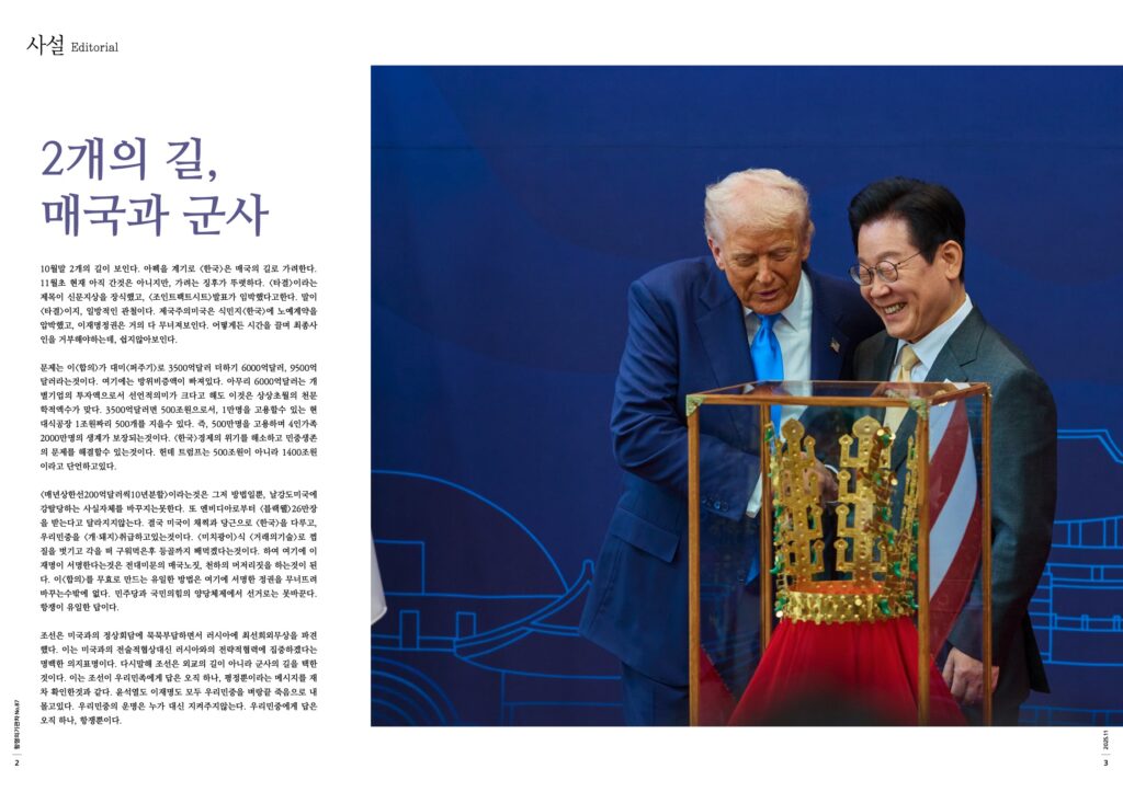 10월말 2개의 길이 보인다. 아펙을 계기로 <한국>은 매국의 길로 가려한다. 11월초 현재 아직 간것은 아니지만, 가려는 징후가 뚜렷하다. <타결>이라는 제목이 신문지상을 장식했고, <조인트팩트시트>발표가 임박했다고한다. 말이 <타결>이지, 일방적인 관철이다. 제국주의미국은 식민지<한국>에 노예계약을 압박했고, 이재명정권은 거의 다 무너져보인다. 어떻게든 시간을 끌며 최종사인을 거부해야하는데, 쉽지않아보인다.