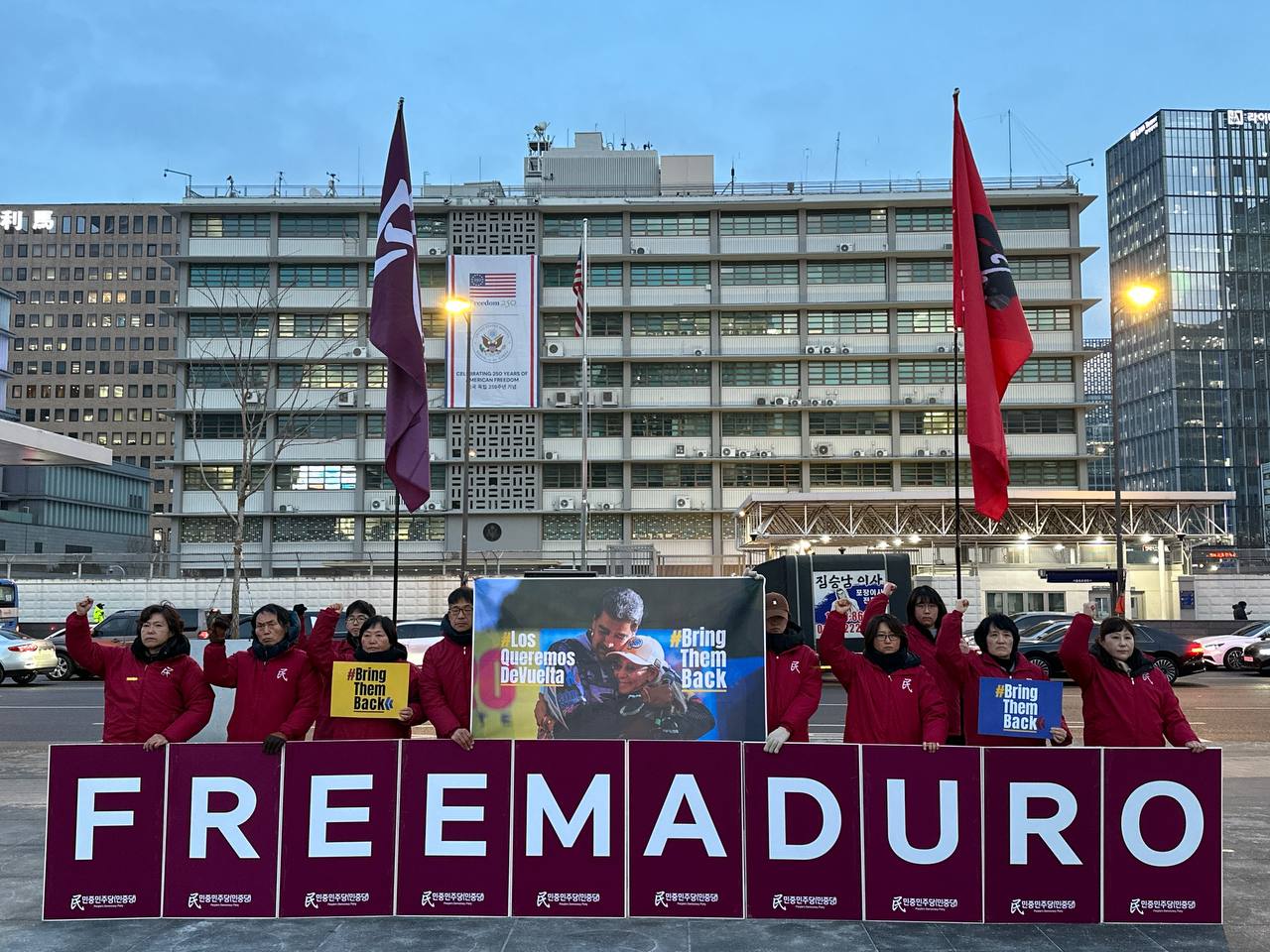이어 <제국주의폭압에 고통받는곳, 제국주의침략이 극심한곳 그 곳이 반제반미전선에서 최전선이다. 미제국주의는 패권의 중심을 서반구로 옮겨 자국의 이익을 극대화하려 발악하고 있지만, 유럽에서도 아시아에서도 여전히 군사정치적, 경제적 패권을 놓지 않고 있다. 우크라이나전과 서아시아전을 멈추겠다고 하면서도 이란에 대한 내정간섭과 군사공격을 위협하고, 조선중국러시아에 대한 적대정책도 바뀐 것은 없다. 제국주의야욕에 브레이크를 걸수 있는 힘은 우리의 자주의지, 민중민주정신에 있다. <한국>의 자주와 민주, 평화와 통일의 그날을 위해 베네수엘라민중과 반제반미연대를 더욱 굳건히 할 것이다.>고 목소리를 높였다.