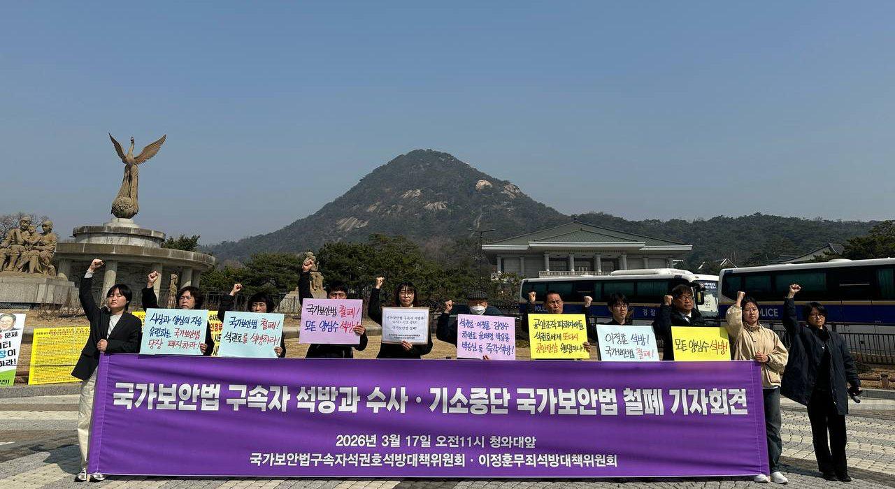 17일 국가보안법구속자석권호석방대책위원회와 이정훈무죄석방대책위원회는 청와대앞에서 <국가보안법구속자 석방과 수사·기소 중단, 국가보안법 철폐!> 기자회견을 진행했다.