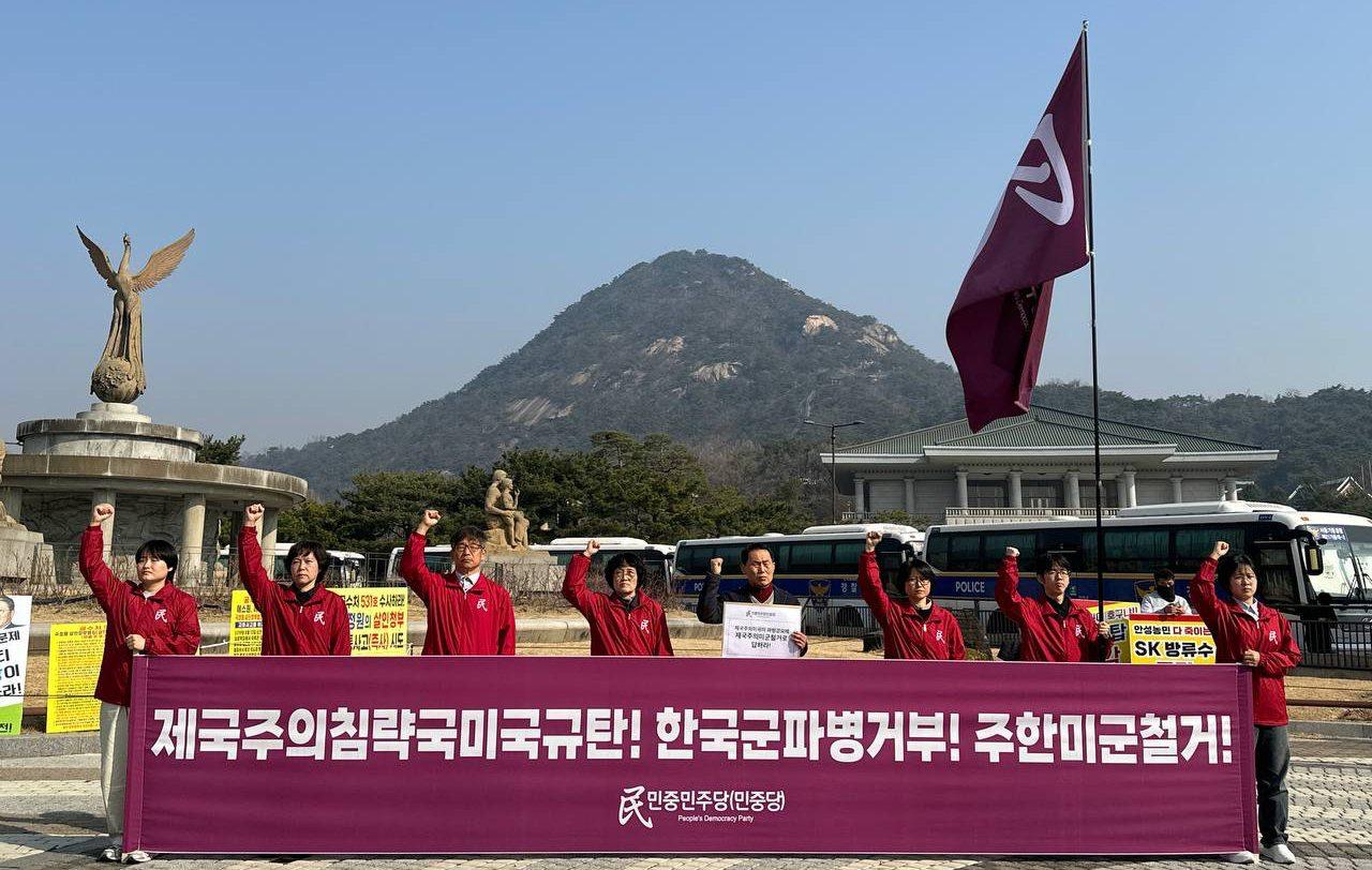 17일 민중민주당(민중당)은 청와대앞에서 <제국주의침략국미국규탄 <한국>군파병거부 주<한>미군철거!> 기자회견을 진행했다.