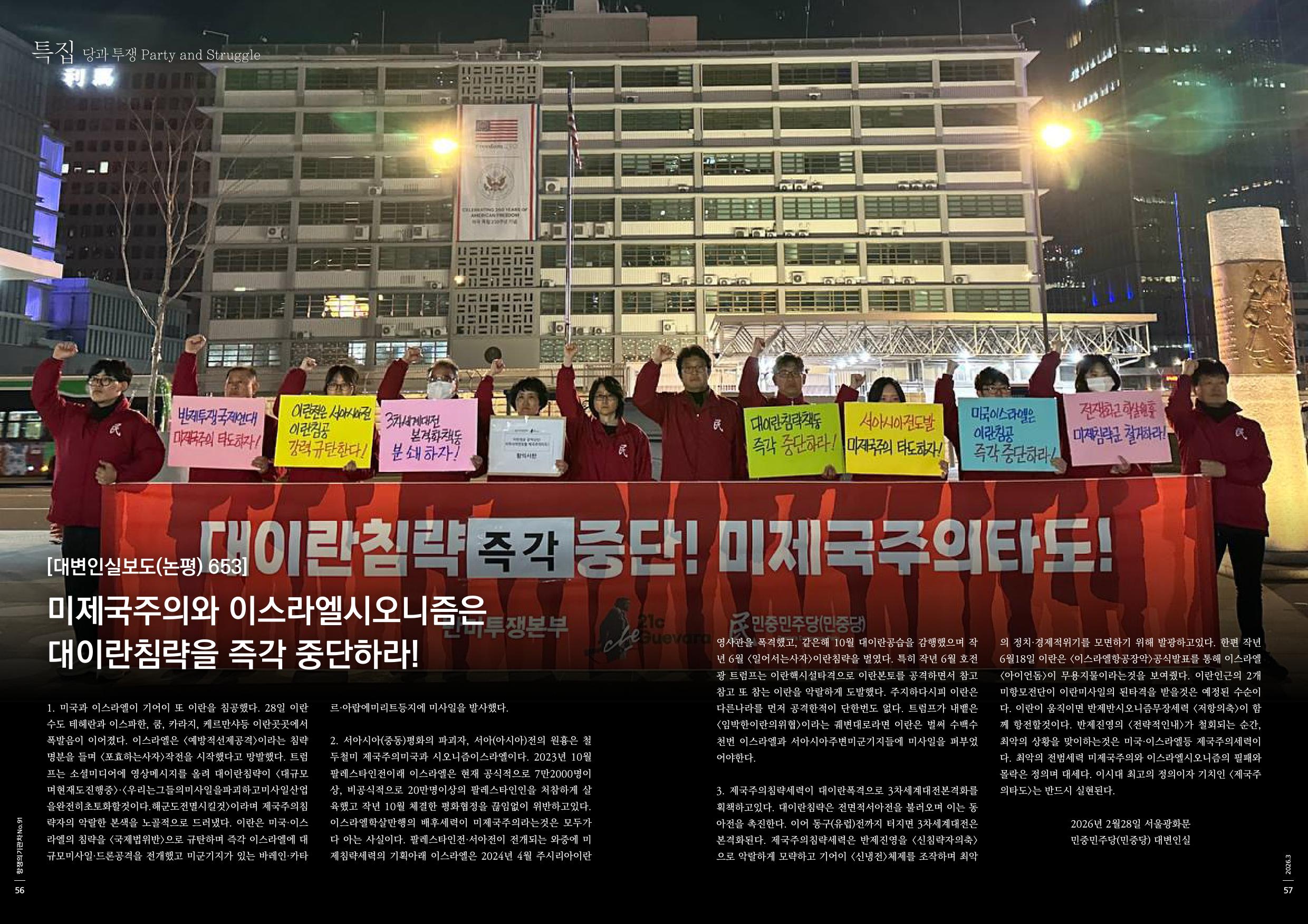 1. 미국과 이스라엘이 기어이 또 이란을 침공했다. 28일 이란수도 테헤란과 이스파한, 쿰, 카라지, 케르만샤등 이란곳곳에서 폭발음이 이어졌다. 이스라엘은 <예방적선제공격>이라는 침략명분을 들며 <포효하는사자>작전을 시작했다고 망발했다. 트럼프는 소셜미디어에 영상메시지를 올려 대이란침략이 <대규모며현재도진행중>·<우리는그들의미사일을파괴하고미사일산업을완전히초토화할것이다.해군도전멸시킬것>이라며 제국주의침략자의 악랄한 본색을 노골적으로 드러냈다. 이란은 미국·이스라엘의 침략을 <국제법위반>으로 규탄하며 즉각 이스라엘에 대규모미사일·드론공격을 전개했고 미군기지가 있는 바레인·카타르·아랍에미리트등지에 미사일을 발사했다.
