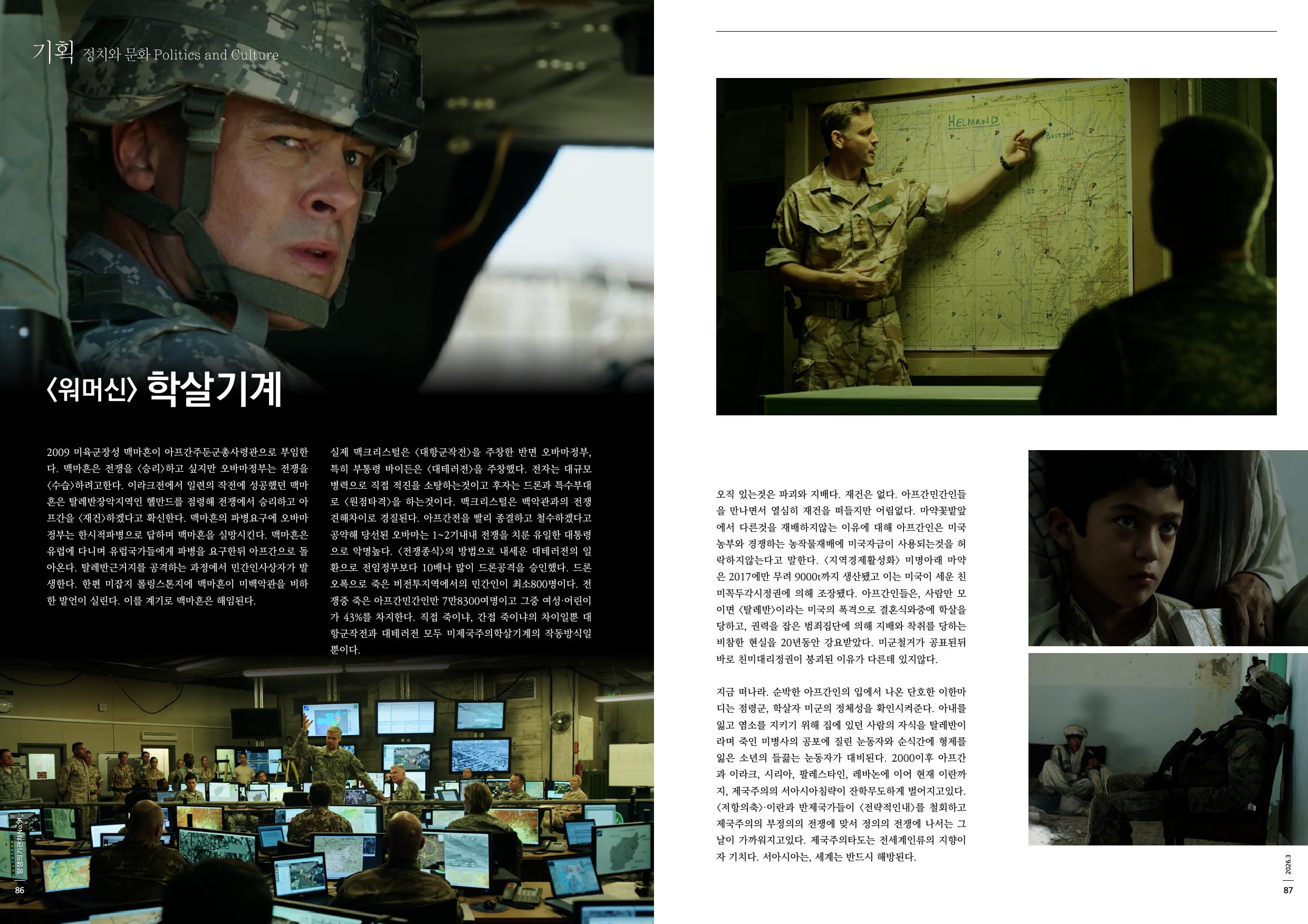 실제 맥크리스털은 <대항군작전>을 주창한 반면 오바마정부, 특히 부통령 바이든은 <대테러전>을 주창했다. 전자는 대규모병력으로 직접 적진을 소탕하는것이고 후자는 드론과 특수부대로 <원점타격>을 하는것이다. 맥크리스털은 백악관과의 전쟁견해차이로 경질된다. 아프간전을 빨리 종결하고 철수하겠다고 공약해 당선된 오바마는 1~2기내내 전쟁을 치룬 유일한 대통령으로 악명높다. <전쟁종식>의 방법으로 내세운 대테러전의 일환으로 전임정부보다 10배나 많이 드론공격을 승인했다. 드론오폭으로 죽은 비전투지역에서의 민간인이 최소800명이다. 전쟁중 죽은 아프간민간인만 7만8300여명이고 그중 여성·어린이가 43%를 차지한다. 직접 죽이냐, 간접 죽이냐의 차이일뿐 대항군작전과 대테러전 모두 미제국주의학살기계의 작동방식일뿐이다.