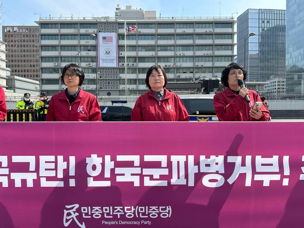23일 민중민주당(민중당)은 미대사관앞에서 <제국주의침략국미국규탄! <한국>군파병거부! 주<한>미군철거!> 18차정당연설회를 진행했다.