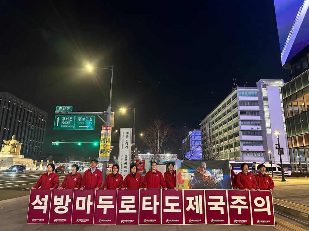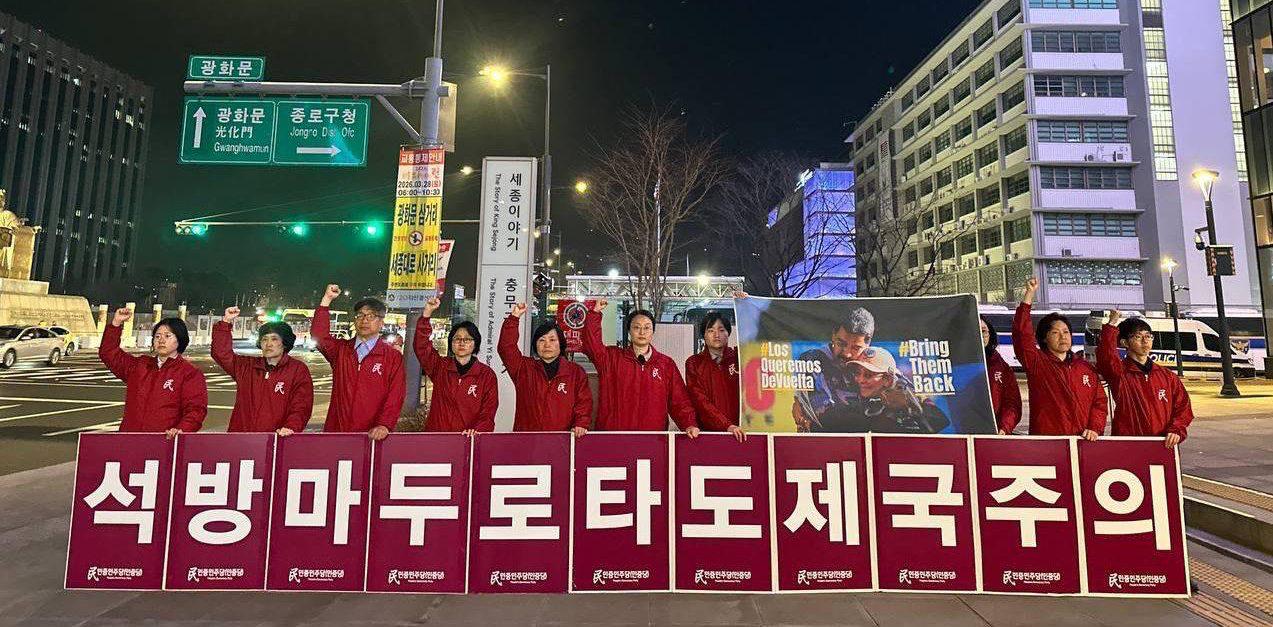 또 <트럼프는 베네수엘라를 침략하고 마두로대통령부부를 불법납치·감금하고 이란을 침공하며 이란의 최고지도자 하메네이를 폭사시키며 정권을 교체하겠다 떠들지만 베네수엘라도 이란도 미국트럼프의 뜻대로 되지않는다는 것을 알아야한다. 여전히 민중들의 힘은 꼬무나로 모아지며 아무리 힘들어도 자신들의 조국을 지키고 평화를 지키기 위해 반제투쟁의 길로 나설 것이라는 것을 트럼프는 무섭게 생각해야 할 것이다. 민중민주당은 베네수엘라민중정권의 지도자 마두로대통령과 저명한 여성활동가 플로레스영부인의 즉각석방을 촉구하며 베네수엘라볼리바르혁명을 지지하는 투쟁을 멈추지 않을 것이다. 전세계민중과 제국주의미국을 타도하는 날까지 힘차게 싸우겠다.>고 결의를 밝혔다.