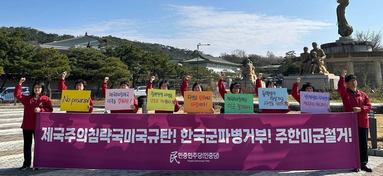 민중민주당청년학생당원은 <사면초가에 처한 제국주의침략세력은 전세계에 침략의 총칼을 무자비하게 휘두르고 있다. 우리는 <한국>군 파병을 강력히 거부한다. <한국>은 침략전쟁에 가세하지 말아야 한다. 또한 시민사회단체와 대학가에서도 파병반대운동이 빠르게 확산되고 있다. 그럼에도 이재명정부는 미국눈치를 보며 분명한 입장을 취하지 않고 있다.>며 <이란지도부와 여학생들을 무참히 살육한 자들이 누구인가. 무고한 민중들을 희생한 것도 모자라 <한국>군 파병을 운운하며 호르무즈해협개방을 압박하고 있는 트럼프정부를 강력히 규탄한다.>고 발언했다.