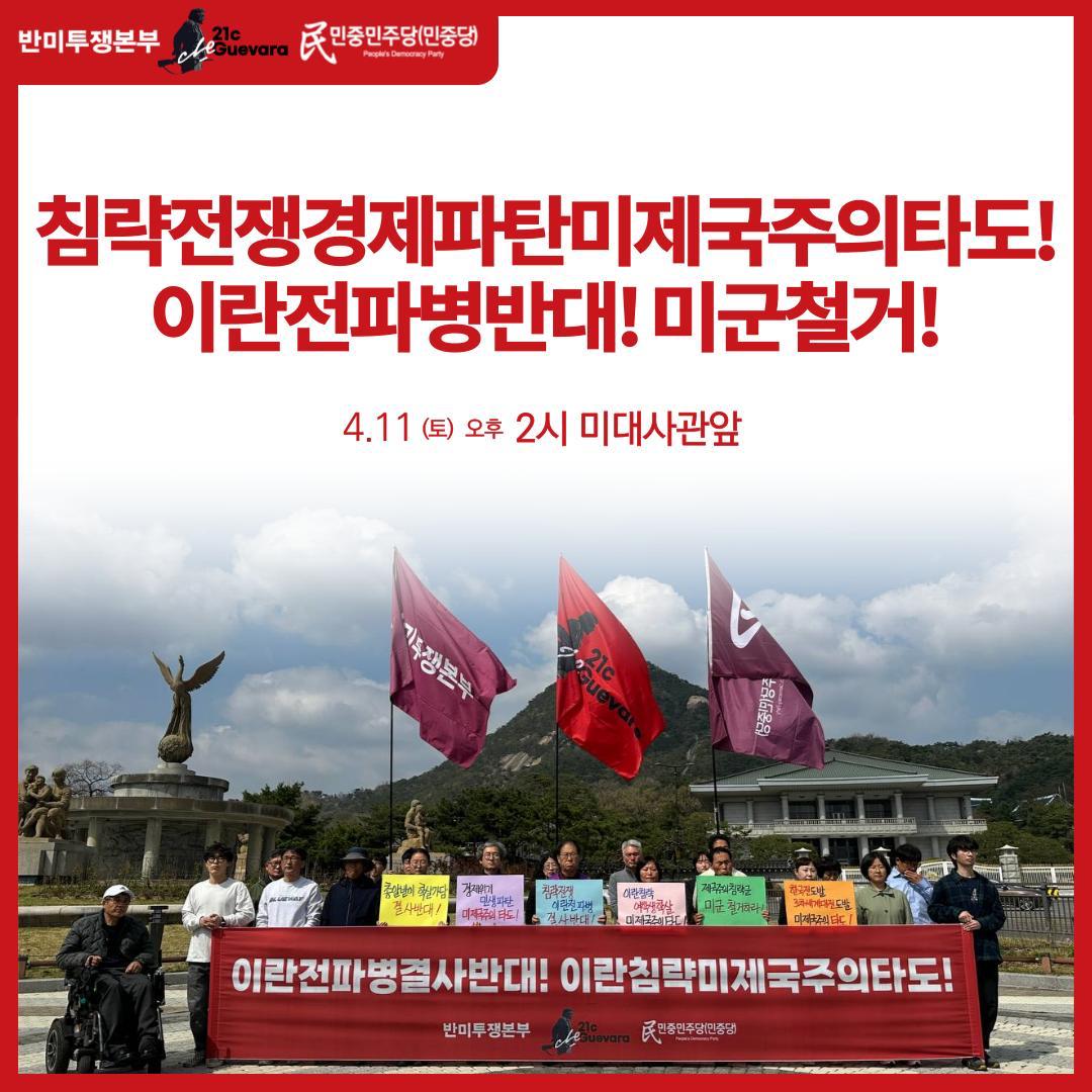 Home 소식 4.11토 14시 미대사관앞 〈침략전쟁경제파탄미제국주의타도! 이란전파병반대! 미군철거!〉정당연설회