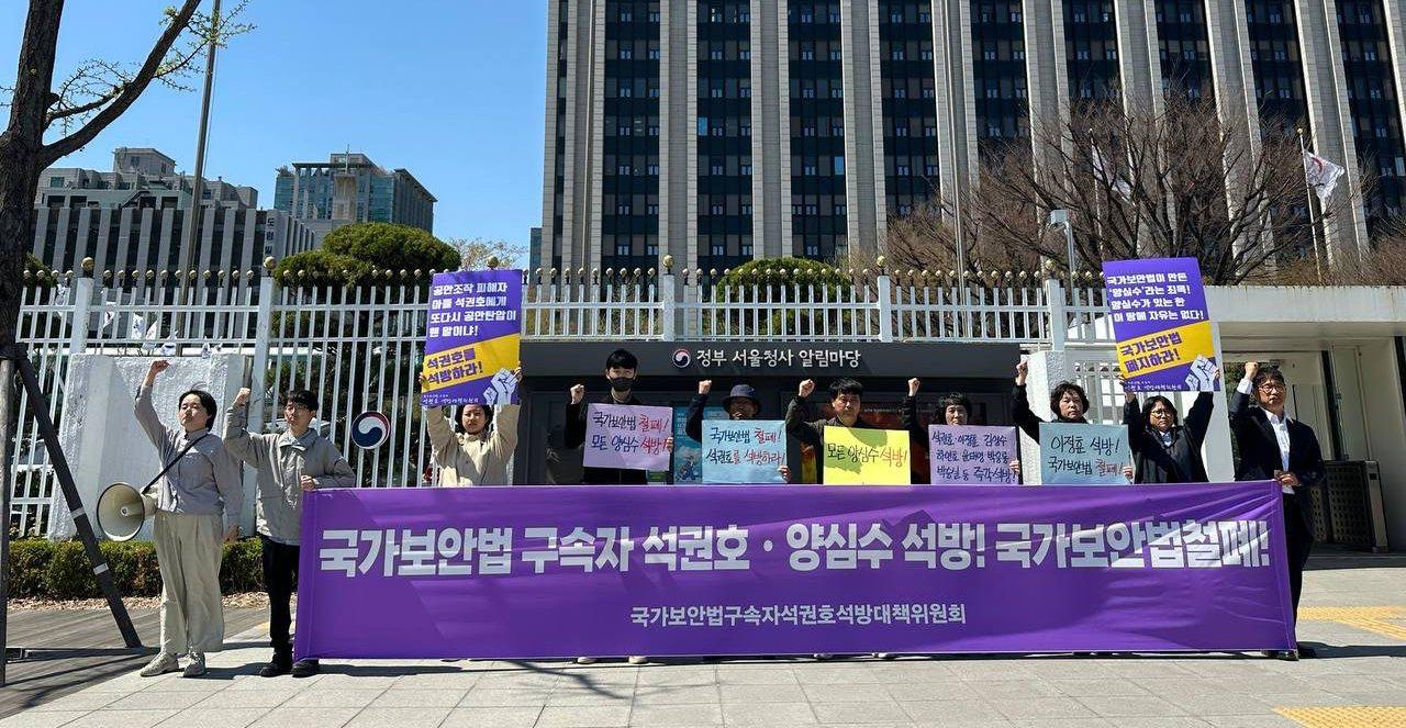 7일 국가보안법구속자석권호석방대책위원회는 정부청사앞에서 <국가보안법 구속자 석권호·양심수 석방! 국가보안법 철폐!> 집회를 진행했다.