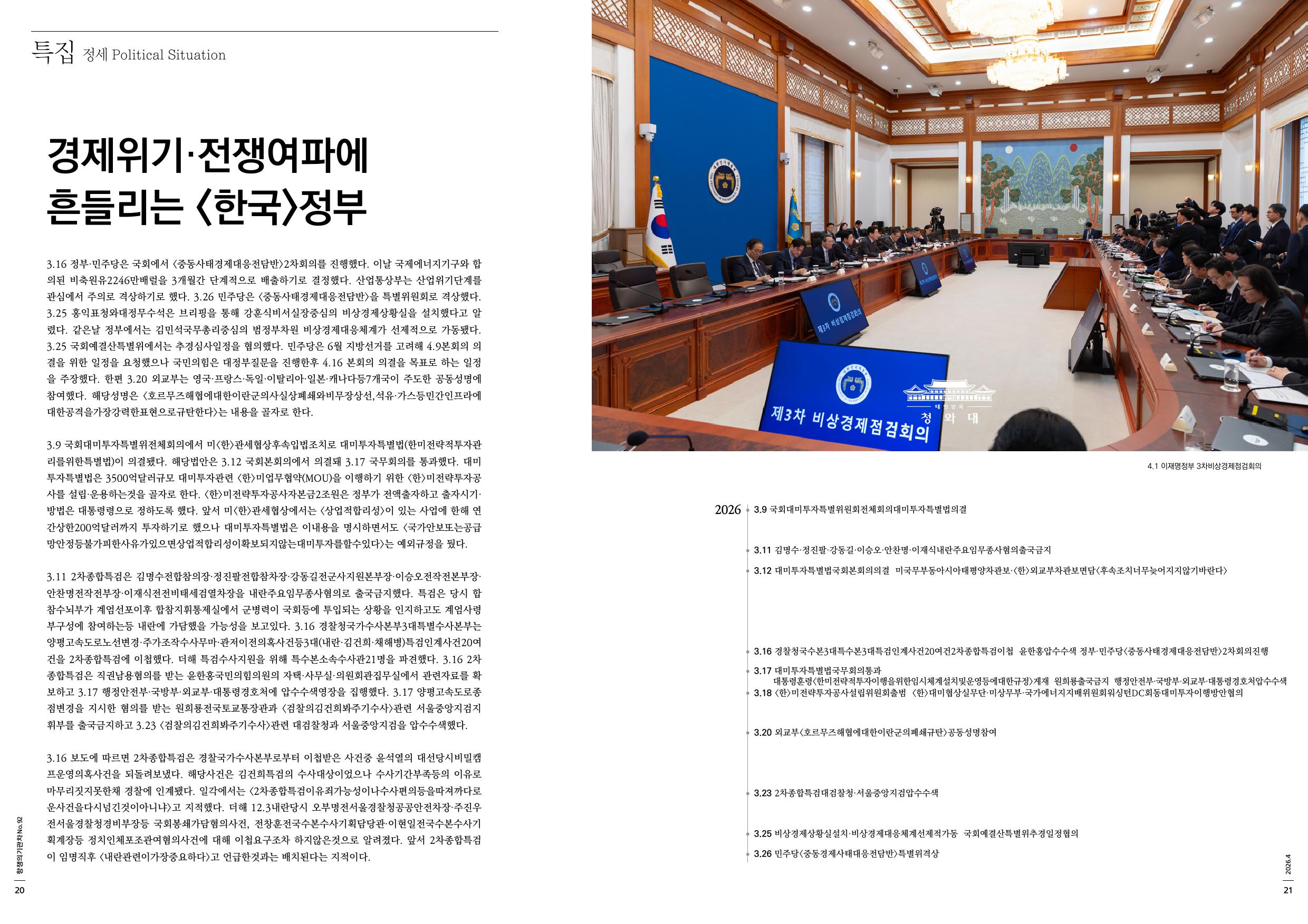 3.16 정부·민주당은 국회에서 <중동사태경제대응전담반>2차회의를 진행했다. 이날 국제에너지기구와 합의된 비축원유2246만배럴을 3개월간 단계적으로 배출하기로 결정했다. 산업통상부는 산업위기단계를 관심에서 주의로 격상하기로 했다. 3.26 민주당은 <중동사태경제대응전담반>을 특별위원회로 격상했다. 3.25 홍익표청와대정무수석은 브리핑을 통해 강훈식비서실장중심의 비상경제상황실을 설치했다고 알렸다. 같은날 정부에서는 김민석국무총리중심의 범정부차원 비상경제대응체계가 선제적으로 가동됐다. 3.25 국회예결산특별위에서는 추경심사일정을 협의했다. 민주당은 6월 지방선거를 고려해 4.9본회의 의결을 위한 일정을 요청했으나 국민의힘은 대정부질문을 진행한후 4.16 본회의 의결을 목표로 하는 일정을 주장했다. 한편 3.20 외교부는 영국·프랑스·독일·이탈리아·일본·캐나다등7개국이 주도한 공동성명에 참여했다. 해당성명은 <호르무즈해협에대한이란군의사실상폐쇄와비무장상선,석유·가스등민간인프라에대한공격을가장강력한표현으로규탄한다>는 내용을 골자로 한다.