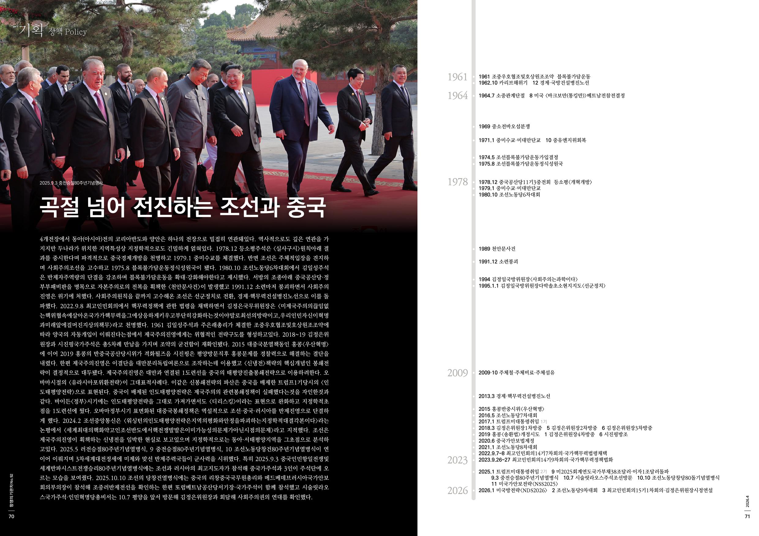 4개전장에서 동아(아시아)전의 코리아반도와 양안은 하나의 전장으로 밀접히 연관돼있다. 역사적으로도 깊은 연관을 가지지만 두나라가 위치한 지역특성상 지정학적으로도 긴밀하게 얽혀있다. 1978.12 등소평주석은 <실사구시>원칙아래 결과를 중시한다며 파격적으로 중국경제개방을 천명하고 1979.1 중미수교를 체결했다. 반면 조선은 주체적입장을 견지하며 사회주의조선을 고수하고 1975.8 블록불가담운동정식성원국이 됐다. 1980.10 조선노동당6차대회에서 김일성주석은 반제자주역량의 단결을 강조하며 블록불가담운동을 확대·강화해야한다고 제시했다. 서방의 조종아래 중국공산당·정부부패비판을 명목으로 자본주의로의 전복을 획책한 <천안문사건>이 발생했고 1991.12 소련마저 붕괴하면서 사회주의진영은 위기에 처했다. 사회주의원칙을 끝까지 고수해온 조선은 선군정치로 전환, 경제·핵무력건설병진노선으로 이를 돌파했다. 2022.9.8 최고인민회의에서 핵무력정책에 관한 법령을 채택하면서 김정은국무위원장은 <미제국주의의끊임없는핵위협속에살아온국가가핵무력을그에상응하게키우고부단히강화하는것이야말로최선의방략이고,우리인민자신이혁명과미래앞에걸머진지상의책무>라고 천명했다. 1961 김일성주석과 주은래총리가 체결한 조중우호협조및호상원조조약에 따라 양국의 자동개입이 이뤄진다는점에서 제국주의진영에게는 위협적인 전략구도를 형성하고있다. 2018~19 김정은위원장과 시진핑국가주석은 총5차례 만남을 가지며 조약의 굳건함이 재확인됐다. 2015 대중국분열책동인 홍콩<우산혁명>에 이어 2019 홍콩의 반중국공산당시위가 격화될즈음 시진핑은 평양방문직후 홍콩문제를 경찰력으로 해결하는 결단을 내렸다. 한편 제국주의진영은 이결단을 대만분리독립여론으로 조작하는데 이용했고 <신냉전>책략의 핵심개념인 봉쇄전략이 결정적으로 대두됐다. 제국주의진영은 대만과 연결된 1도련선을 중국의 태평양진출봉쇄전략으로 이용하려한다. 오바마시절의 <유라시아포위환전략>이 그대표적사례다. 이같은 신봉쇄전략의 파산은 중국을 배제한 트럼프1기당시의 <인도태평양전략>으로 표현된다. 중국이 배제된 인도태평양전략은 제국주의의 관련봉쇄정책이 실패했다는것을 자인한것과 같다. 바이든<정부>시기에는 인도태평양전략을 그대로 가져가면서도 <디리스킹>이라는 표현으로 완화하고 지정학적초점을 1도련선에 뒀다. 오바마정부시기 표면화된 대중국봉쇄정책은 역설적으로 조선·중국·러시아를 반제진영으로 단결하게 했다. 2024.2 조선중앙통신은 <워싱턴의인도태평양전략은지역의평화와안정을파괴하는지정학적대결각본이다>라는 논평에서 <세계최대의핵화약고인조선반도에서핵전쟁발발은이미가능성의문제가아닌시점의문제>라고 지적했다. 조선은 제국주의진영이 획책하는 신냉전을 임박한 현실로 보고있으며 지정학적으로는 동아·서태평양지역을 그초점으로 분석하고있다. 2025.5 러전승절80주년기념열병식, 9 중전승절80주년기념열병식, 10 조선노동당창건80주년기념열병식이 연이어 이뤄지며 3차세계대전정세에 미제와 맞선 반제주력국들이 군사력을 시위했다. 특히 2025.9.3 중국인민항일전쟁및세계반파시스트전쟁승리80주년기념열병식에는 조선과 러시아의 최고지도자가 참석해 중국가주석과 3인이 주석단에 오르는 모습을 보여줬다. 2025.10.10 조선의 당창건열병식에는 중국의 리창중국국무원총리와 메드베데브러시아국가안보회의부의장이 참석해 조중러반제전선을 확인하는 한편 또럼베트남공산당서기장·국가주석이 함께 참석했고 시술릿라오스국가주석·인민혁명당총비서는 10.7 평양을 앞서 방문해 김정은위원장과 회담해 사회주의권의 연대를 확인했다.