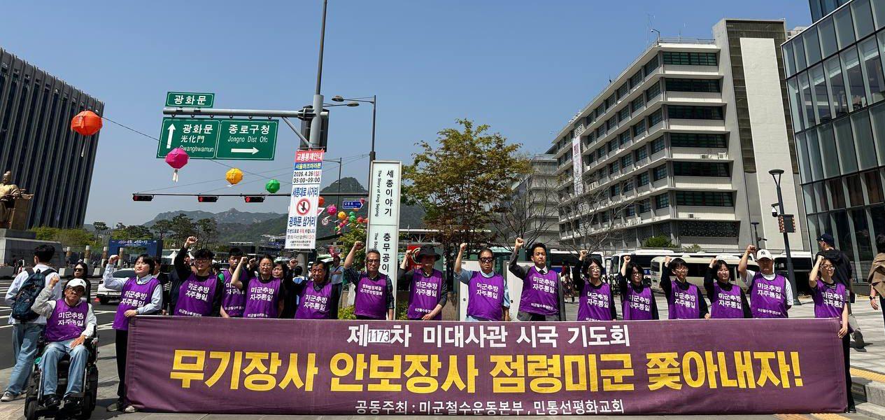 18일 미군철수운동본부와 민통선평화교회는 미대사관앞에서 1174차 시국기도회를 진행했다.