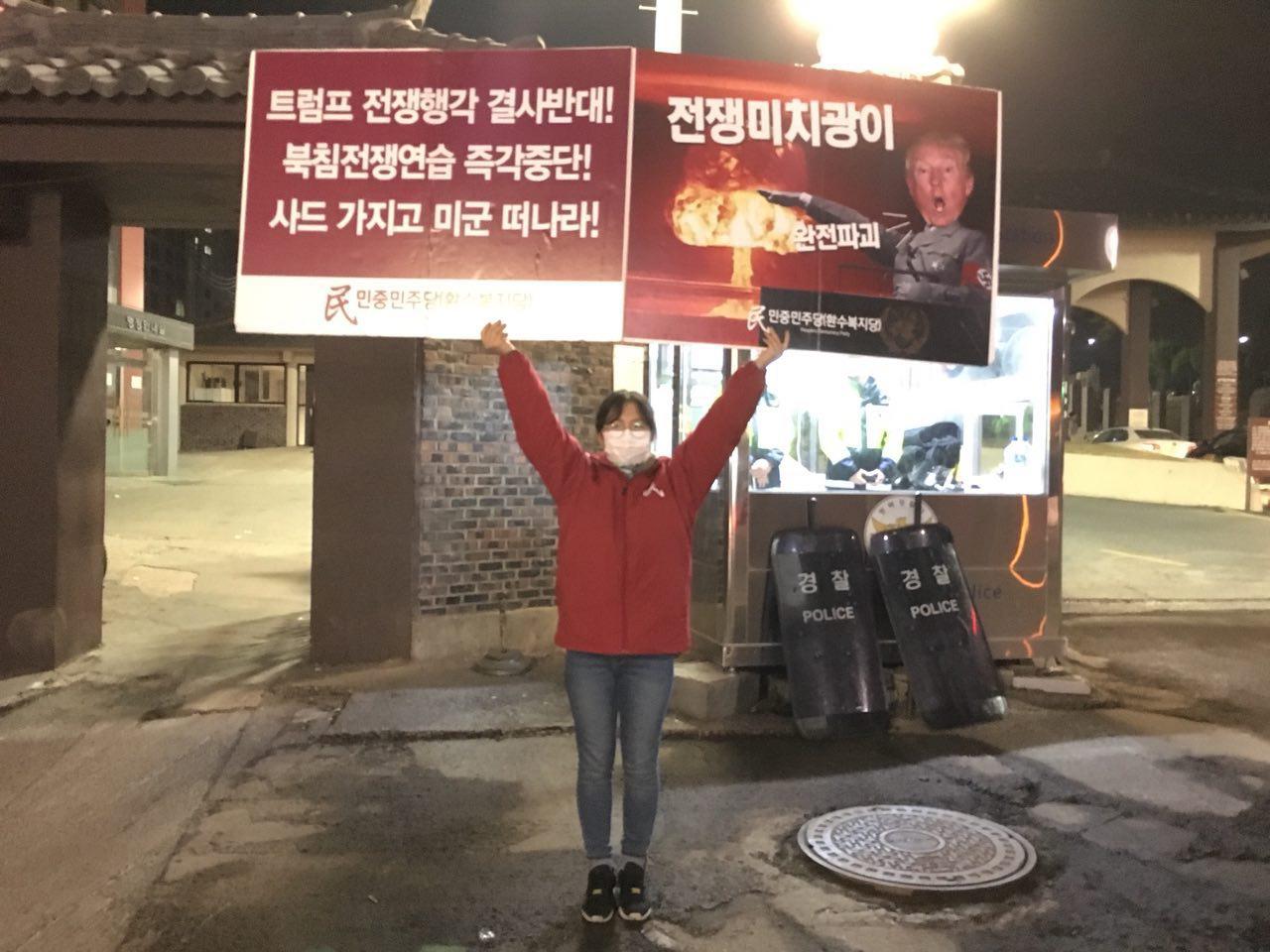 민중민주당(환수복지당) 한명희대표는 트럼프 방남 하루전인 11월 6일서울 종로구 미국대사관앞 삼봉로에 있는 노천당사에서 <트럼프 전쟁행각 결사반대! 북침전쟁연습 즉각중단!> 노숙농성에 돌입했다.