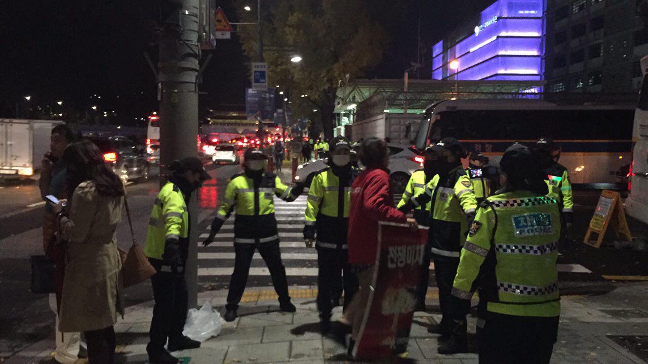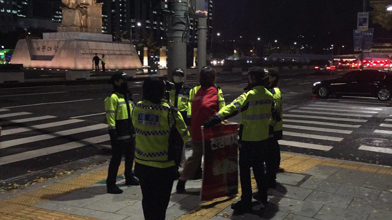 이날 6명의 여경들은 전원이 마스크를 쓴채 학생당원이 들고 있던 <트럼프는 전쟁미치광이> 이미지피시를 붙잡고 양팔을 꽉 낀채 폭력적으로 미대사관 길 건너편으로 강제 이동조치시켰습니다.