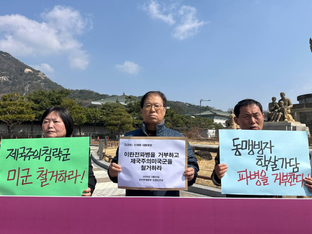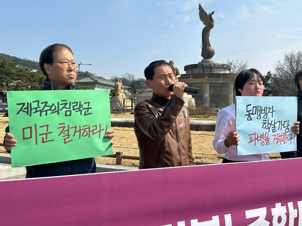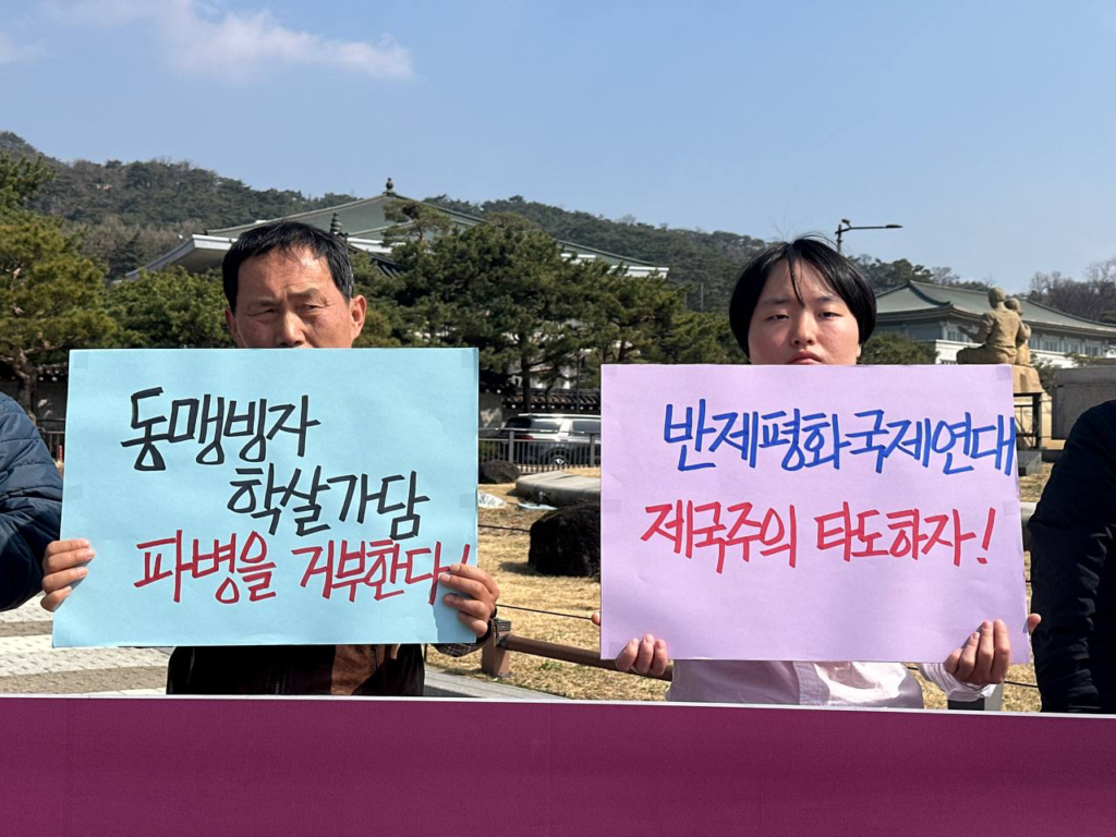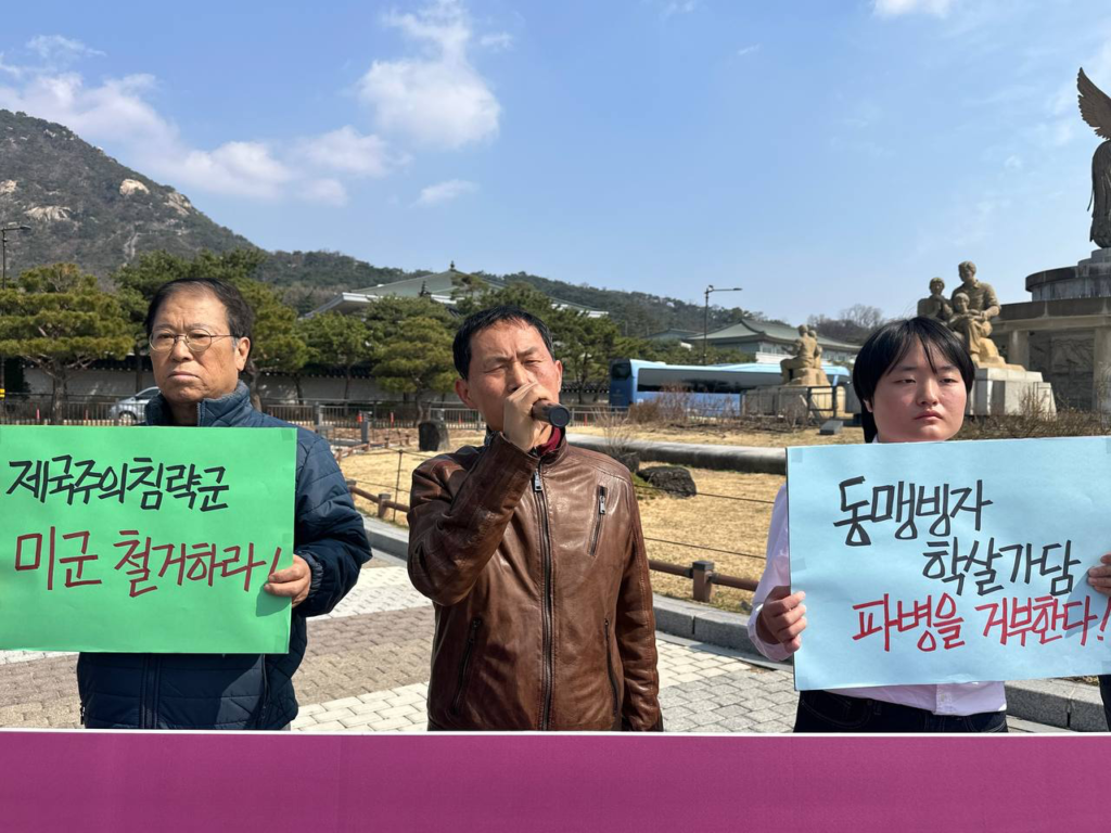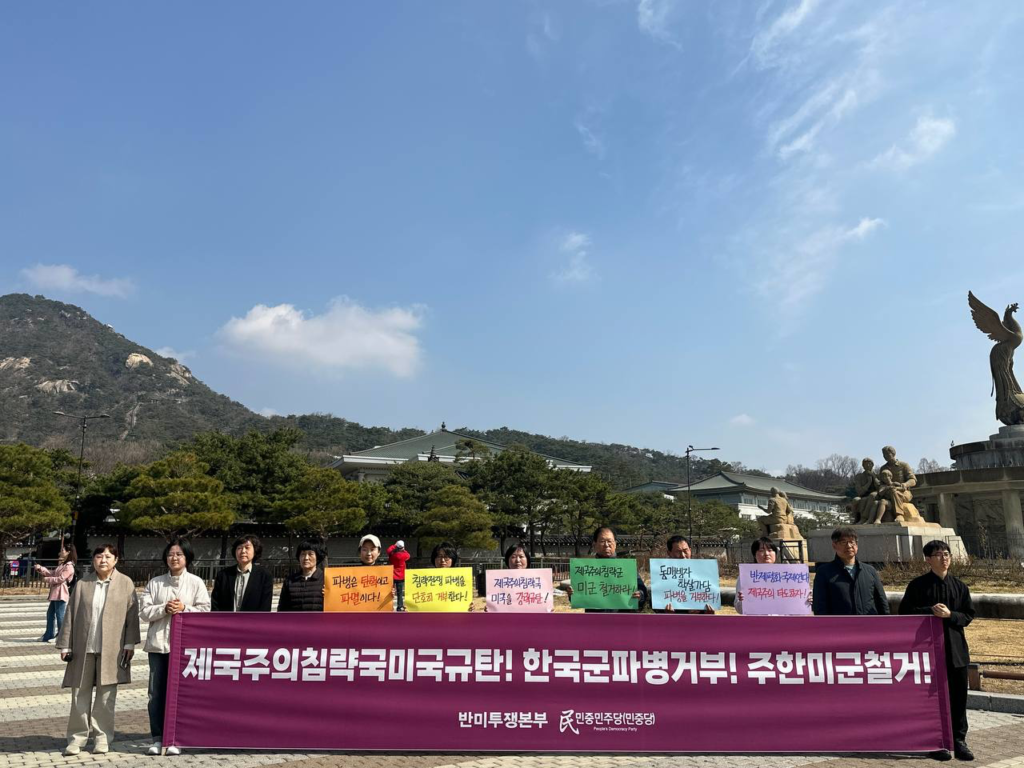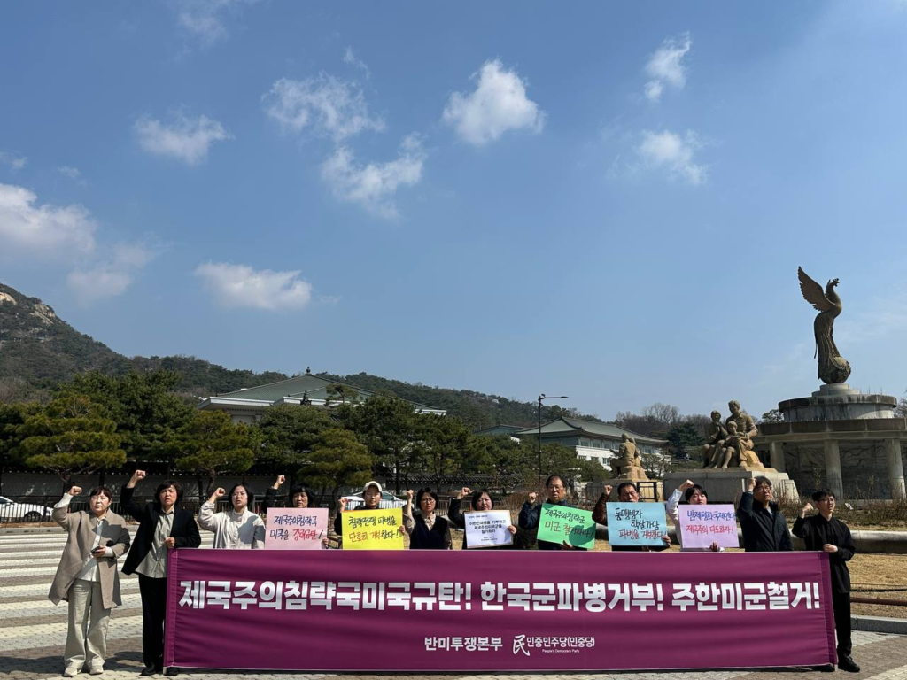 25일 반미투쟁본부와 민중민주당(민중당)은 청와대앞에서 <제국주의침략국미국규탄! <한국>군파병거부! 주<한>미군철거!> 기자회견을 진행했다.