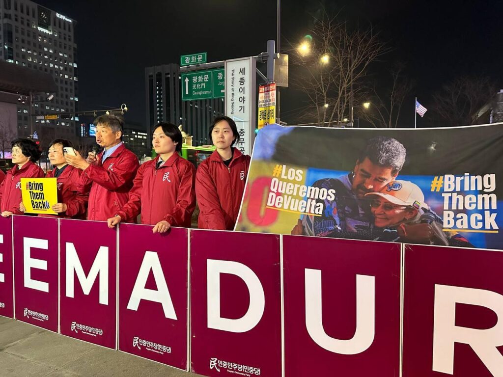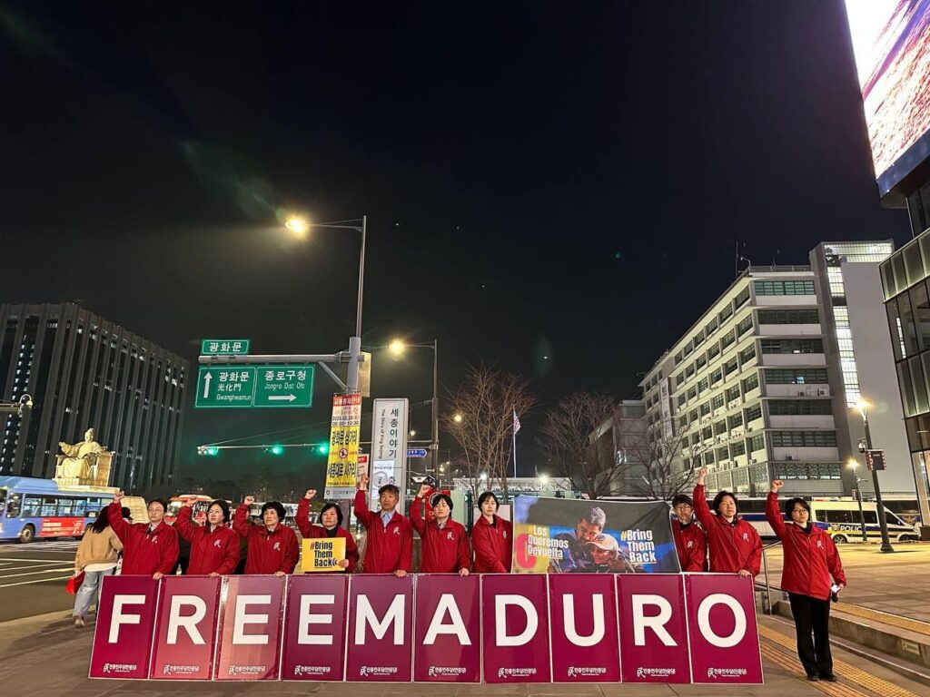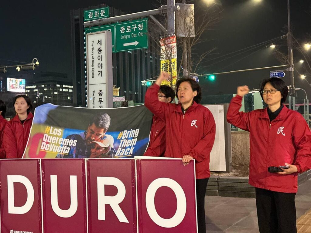민중민주당경기도당위원장은 <반제투사·민중지도자 마두로를 석방하라. 이시간 미국에선 반제투사며 민중지도자인 마두로 베네수엘라대통령을 재판하고 있다고 한다. 미제침략세력은 새해벽두부터 베네수엘라를 침략해 반제민중정권의 지도자 마두로대통령과 저명한 여성활동가 플로레스를 납치한데 이어 쿠바원유공급을 완전히 차단하며 대쿠바고립압살책동을 벌이는 미친짓을 하고 있다. 트럼프파시스트는 7일에는 중남미친미국가들을 모아놓고 <미주카르텔대응연합>을 조작해 <범죄카르텔소탕>을 명분삼아 미군주도의 공동군사력사용을 선언했고, 16일 <쿠바를 손에 넣는 영광을 누리게 될 것>이라는 망발을 했다.>고 규탄했다.