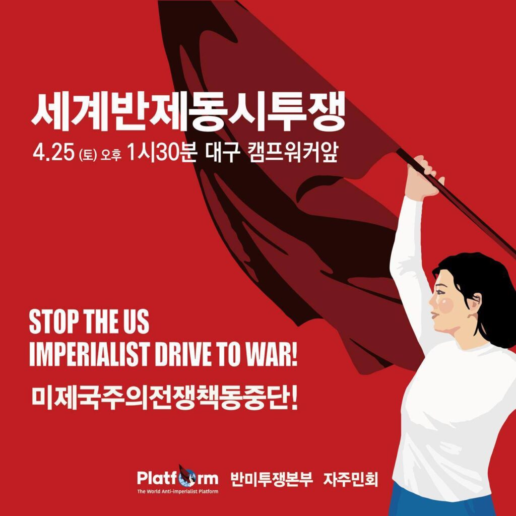 Home소식 소식 4.25토 13시30분 대구캠프워커앞 〈미제국주의전쟁책동중단!〉세계반제동시투쟁 2026년 04월 02일 Previous article4.4토 14시 청와대앞 〈이란전파병결사반대! 이란침략미제국주의타도!〉정당연설회 - Advertisement - 최신글 4.4토 14시 청와대앞 〈이란전파병결사반대! 이란침략미제국주의타도!〉정당연설회 2026년 04월 02일 〈국민의 뜻을 받들어 단호히 파병을 거부하라〉 민중민주당 청와대앞 23차정당연설회 2026년 03월 31일 3.31화 10시 청와대앞 〈제국주의침략국미국규탄! 한국군파병거부! 주한미군철거!〉정당연설회 2026년 03월 30일 〈이재명정부는 이란전에 대한 처신을 똑바로 해야할 것〉 민중민주당 1171차자주통일시국기도회 발언 2026년 03월 28일 〈침략국제국주의미국규탄! 침략전쟁파병거부! 침략군미군철거!〉 미대사관앞 반제반파쇼정당연설회 2026년 03월 28일