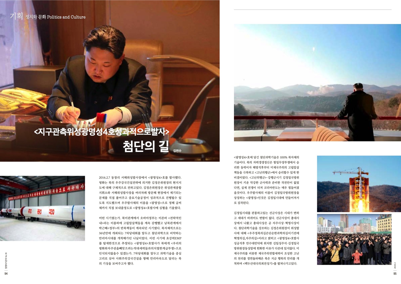 정치와문화 <혁명의 시대, 과학기술의 시대>는 총론에서 김정일국방위원장이 1991년 전국과학자대회참가자들에게 보낸 서한 <과학기술발전에서 새로운 전환을 일으키자>를 발췌했다. 이어 <과학기술은 사상이자 총대며 미래>에서 북의 과학기술전당에 대해 건축평론을, <자립경제와 새세기산업혁명의 나라>에서는 북의 과학기술발전역사를 정리했다. 끝으로 기록영화 <지구관측위성광명성4호 성과적으로 발사>에 대해 평했다.